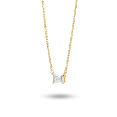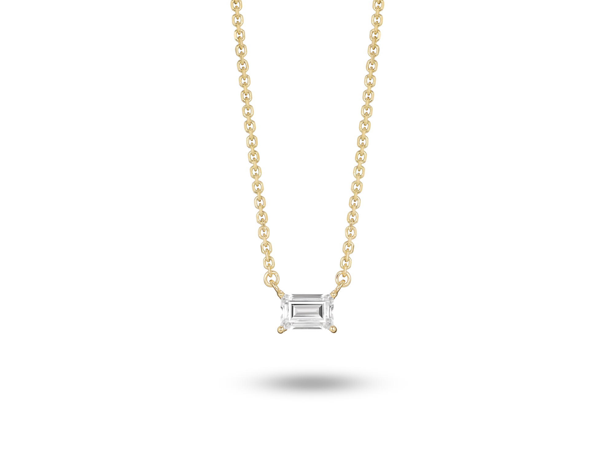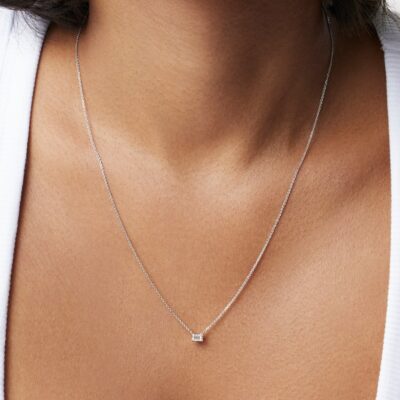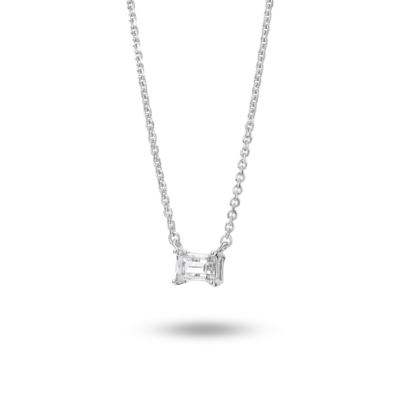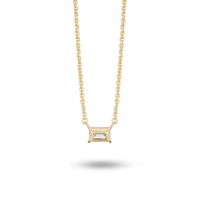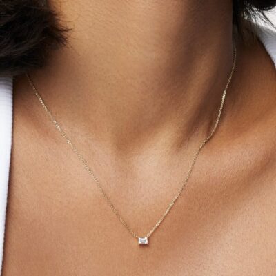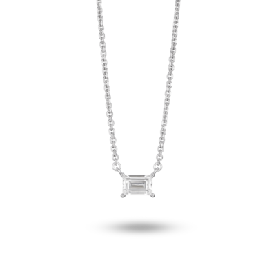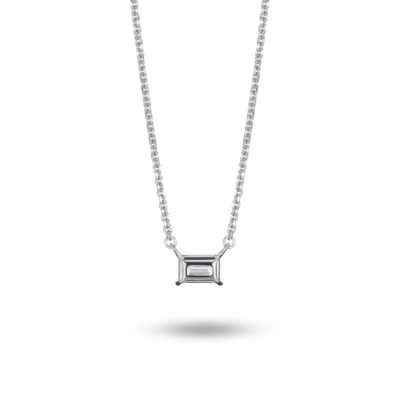 This baguette cut pendant offers a timeless, Art Deco inspired appeal that will become your new everyday accessory. Available in 14k white or yellow gold to suit your preference, it’s great for layering. The ¼ carat stone is graded at VS+ clarity, Near Colorless and grown from 100% renewable wind energy.