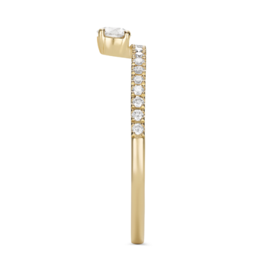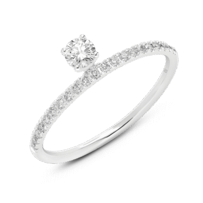 A ⅐ carat stone held in a secure four prong setting. The setting gives the illusion that the stone is floating from the pavé band. Each stone is VS+ clarity, Very Good Cut and Near Colorless, giving off a stunning sparkle. The band width is 1.25mm and available in 14k white or yellow gold to suit your preference.